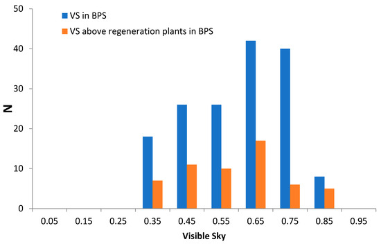 Ref. [45] also found that the availability of light in mixed stands of P. brutia and P. nigra was a very important factor that affected the regeneration plant density of the two species. In the above research, it was found that the P. nigra regeneration plants (0.11–0.5 m in height) presented their highest density at VS values between 0.2 and 0.4, while the P. brutia regeneration plants had VS values greater than 0.35.