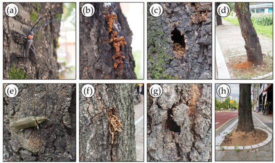In recent times, infestations of A. bungii and M. raddei in their host trees raised management issues in urban landscapes in Korea [24]. The larvae of these beetles, like other wood-boring insects, feed on the interior part of trees, targeting the cambium, phloem, and xylem, thereby disrupting the flow of nutrients and moisture [18,25]. Persistence of this damage may cause the development of hollow spaces within the affected trees, leading to their weakening and death [21,26]. The damage inflicted by cerambycid beetle larvae can typically be identified through external characteristics, although there are various wood borer species, such as Curculionidae (Coleoptera), Buprestidae (Coleoptera), and Cossidae (Lepidoptera). These external characteristics include the presence of a substantial amount of frass, sawdust-like wood materials, and resin exudation. Moreover, cerambycid beetles usually create larger-sized holes associated with adult emergence. These distinctive symptoms are easily noticeable by inspectors or managers, particularly in dead or dying trees.