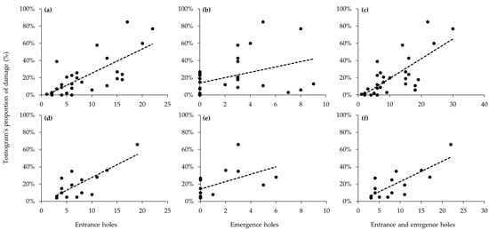 Correlations between the number of holes based on visual investigation and the damage rates based on sonic tomography: (a–c) measurement of Prunus × yedoensis infested by Aromia bungii; (d–f) measurement of Quercus palustris infested by Massicus raddei. (a,d) number of entrance holes against damage rates; (b,e) number of emergence holes against damage rates; and (c,f) number of entrance and emergence holes against damage rates. Dashed lines indicate linear regression lines.