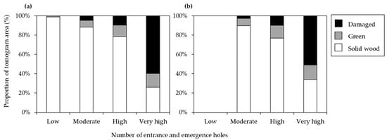 The proportion of tomogram areas in three categories (solid wood, green, and damaged) in relation to the number of entrance and emergence holes caused by cerambycid beetle larvae in (a) Prunus × yedoensis (n = 30) and (b) Quercus palustris (n = 15). Damage level categories based on the natural logarithm-transformed number of holes are as follows: low (0.1 to 1.0), moderate (1.1 to 2.0), high (2.1 to 3.0), and very high (3.1 to 4.0).