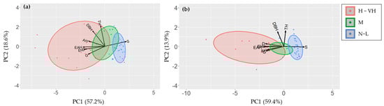 PCA biplots displaying the first two principal components (PC1 and PC2) for different tree health assessment methods applied to (a) Prunus × yedoensis and (b) Quercus palustris. Arrows represent the loadings of the original variables, i.e., visual investigation, sonic tomography, and tree data, on the principal components, while points represent individual trees, colored by their damage levels. The damage level was basically classified by the LN-transformed number of holes, such as 0 (normal), 0.1 to 1.0 (low), 1.1 to 2.0 (moderate), 2.1 to 3.0 (high), and 3.1 to 4.0 (very high), but three groups, i.e., N-L (normal-low), M (moderate), and H-VH (high-very high), were represented in biplot because number of trees for normal and very high groups were too low to represent. Abbreviations: EH—larval entrance holes; AH—adult emergence holes; EAH—entrance and emergence holes; S—solid wood; G—green; D—damaged; DBH—diameter at breath height; TH—tree height.