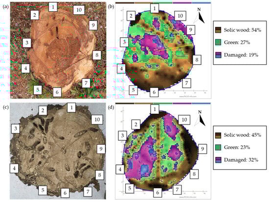 Comparison of the sonic tomograms and the cross-sections of dead trees. (a) Dead P. × yedoensis infested by Aromia bungii and (b) its sonic tomogram; (c) dead Q. palustris infested by M. raddei and (d) its sonic tomogram. The numbers indicate the position of the sensor, with #1 facing north. Different colors indicate wood decay severities: black and brown indicate solid wood (non-damaged areas); green is assessed in relation to the overall damage; and violet and blue indicate damaged areas (hollowed or decayed areas).