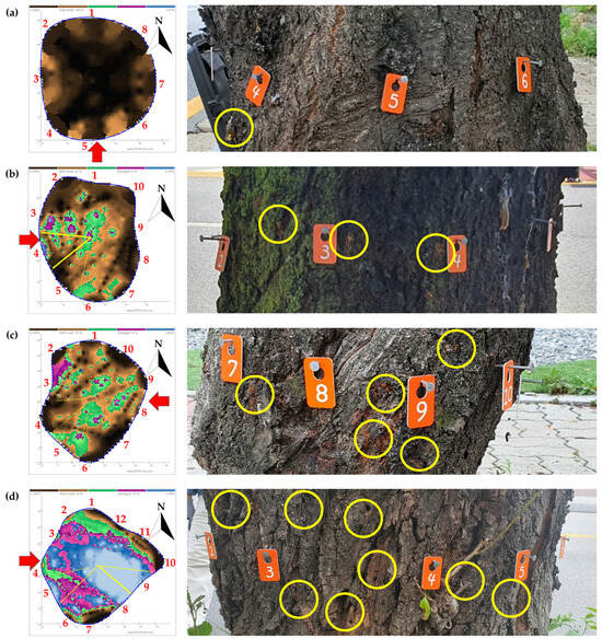 Representative examples of tomography of measured Prunus × yedoensis trees (left panel) with visual images of the area indicated by the red arrow (right panels). Yellow circles on the right panels indicate entrance or emergence holes caused by Aromia bungii: (a) weakly infested but 0% in injury rates in tomogram; (b) moderately infested and 19% in injury rate in tomogram; (c) severely infested and 26% in injury rate in tomogram; (d) severely infested in the past and 85% in injury rate in tomogram. The red numbers in left panels indicate the positions of sensors. Different colors indicate wood decay severities: black and brown indicate solid wood (non-damaged areas); green is assessed in relation to the overall damage; and violet and blue indicate damaged areas (hollowed or decayed areas). To see all four directions of the photographs, refer to Figure A3.