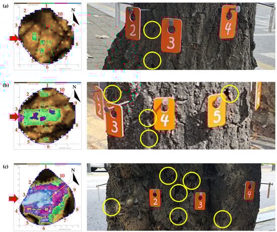 Representative examples of tomography of measured Quercus palustris tree (left panel) with visual images of the area indicated by the red arrow (right panels). Yellow circles on the right panels indicate entrance or emergence holes caused by Massicus raddei: (a) weakly infested and 4% in injury rates in tomogram; (b) moderately infested and 25% in injury rate in tomogram; and (c) severely infested and 66% in injury rate in tomogram. The red numbers in left panels indicate the positions of sensors. Different colors indicate wood decay severities: black and brown indicate solid wood (non-damaged areas); green is assessed in relation to the overall damage; and violet and blue indicate damaged areas (hollowed or decayed areas). To see all four directions of the photographs, refer to Figure A4.
