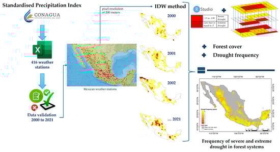 Flow chart to determine the area affected by severe and extreme drought in forest systems in Mexico for the period 2000–2021.