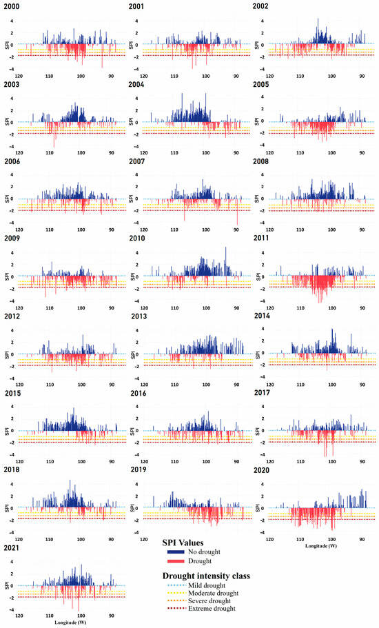 Figure 3 shows the temporal and spatial variations of the SPI-12 in Mexico during the period 2000–2021. The entire national territory is plotted on the x-axis according to its longitudinal orientation (from the Greenwich meridian).