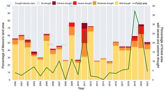 Percentage of Mexico’s land area under some form of drought and forest area under severe and extreme drought.