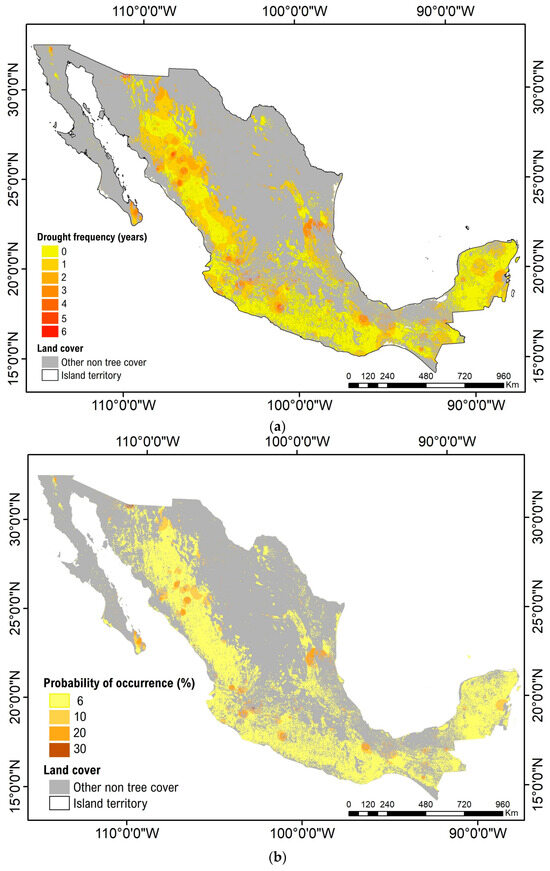 A probability analysis provided a clearer understanding of the possible scenarios associated with environmental risks in the forest ecosystem. Probability is used as a key component in understanding and quantifying potential risks associated with environmental factors and human activities in urban settings [81]. Drought frequency is also a key component of risk analysis. It allows the identification of patterns and trends that can inform forest management strategies [82]. By combining drought probability and frequency, it is possible to develop a more robust and accurate risk assessment, allowing more effective adaptation measures to be designed and implemented to mitigate the impacts of extreme climate variability on Mexico’s forests.