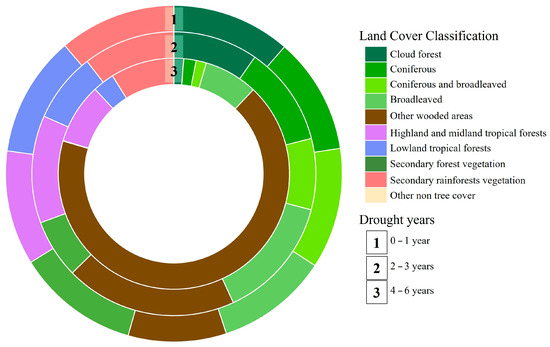 Coniferous, broadleaved, cloud forest, and highland and midland tropical forests are among the vegetation cover types that have experienced at least one year of drought on 90% of their area. In contrast, broadleaved forest, other woodland, lowland forest, and secondary rainforest vegetation have experienced between 2 and 3 years of drought on at least 5% of their area. Most worryingly, these same areas have experienced between 4 and 6 years of drought in at least 0.5% of their area, as shown in Figure 6. However, Mexico has experienced droughts with a frequency of 4 to 10 years (Dobler-Morales and Bocco, 2021). This situation makes vegetation vulnerable. A specific example of this situation is observed in Douglas fir growing in northern Mexico, which requires 6–10 years to fully recover growth rates after extreme drought events [87]. The idea that a forest will always fully recover after disturbance may not always be correct, as multiple droughts may affect its ability to recover to its previous condition. In other words, it is difficult to assess the response of a forest to a single drought without considering the cumulative effects of repeated droughts [38].