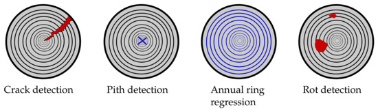 6] aimed to locate the pith region in log ends. Images were the only type of data used for log end grading, which is logical, considering that piths, annual rings, and rot are challenging to detect using point-cloud data. One might be able to detect large cracks in the log end, but depending on the resolution of the scanner, smaller cracks would be easier to locate using images. The model developed by Du et al. [