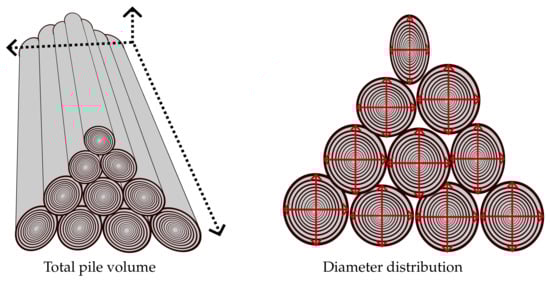 16] made use of short blue rods placed on the log ends as reference objects of a known scale. It was also assumed that the average length of the logs that made up the pile was known, such that the volume of each log could be calculated as the segmented log end area multiplied by the average log length.