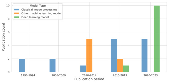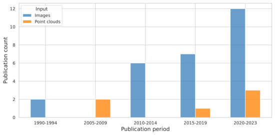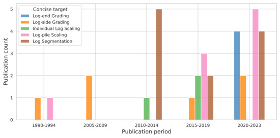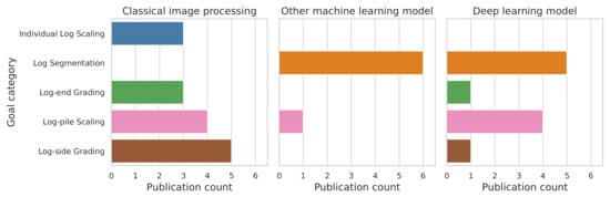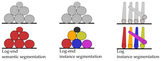 Figure 6. The studies that performed semantic segmentation of log ends produced a binary bitmap where individual pixels are regarded as “log end” or “not log end”. The studies that performed instance segmentation of the log ends produced bitmaps where the log ends were separated from the background. The individual instances of log ends were separated as well, such that they could be analyzed separately. The study that performed instance segmentation of entire logs yielded bitmaps where the pixels of the entire logs were separated from the background, and the individual log instances were held separate. The majority of the studies in this goal category used images of log piles, taken from the log end side as input, with three notable exceptions: Fortin et al. [