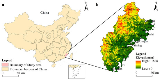 The Fujian Delta region (116°53′21″ E–119°01′38″ E, 23°33′20″ N–25°56′45″ N) is located along the southeastern coast of China’s Fujian Province, across the sea from Taiwan, and includes the cities of Zhangzhou, Quanzhou, and Xiamen, covering a total area of approximately 25,000 km2 (Figure 1). The Fujian Delta region has typically subtropical maritime monsoon weather, with average annual temperatures stabilizing between 20.8 and 23.6 °C and a mean rainfall of 1400–2000 mm. However, as one of the important nodes of the Maritime Silk Road, the Fujian Delta region has a population of more than 18.31 million [55], according to the statistical yearbook of 2022. The Fujian Delta has experienced rapid urbanization [56], with the urbanization rate rising from 40.3% to 69.37% in the period from 2000 to 2020 [57]. Ecological land, such as forests, is occupied by construction land, and the landscape pattern is changing dramatically, which leads to the intensification of landscape ecological risks. The balance between economic development and ecological protection is under significant pressure. Moreover, the forest landscape coverage rate of the Fujian Delta region is close to 50%, with typical forest landscape characteristics, and mountains and hills accounting for more than 80% of the area. The complex natural conditions lead to a fragile ecosystem, which facilitates the occurrence of natural disasters, and thus destroys the original EQ [54]. There are significant challenges inherent in the construction of an ecological civilization. Therefore, the study of the spatiotemporal changes in the EQ and its response to forest landscape structural and functional connectivity in the Fujian Delta region has extensive research value. The results can provide a scientific reference for the sustainable development of other similar cities.