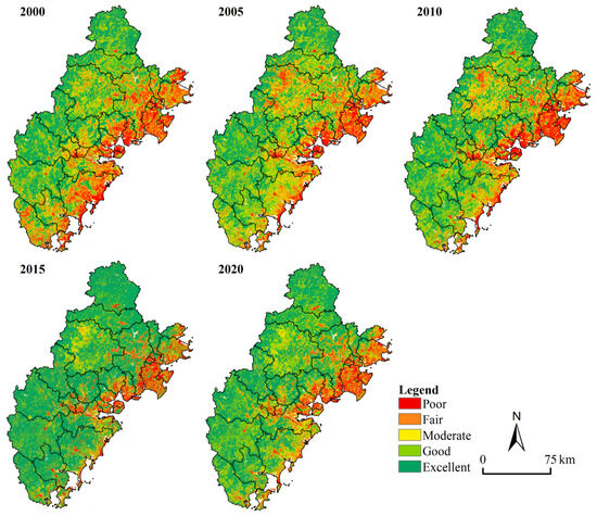 The spatiotemporal distribution of RSEI of different grades in 2000, 2005, 2010, 2015, and 2020.