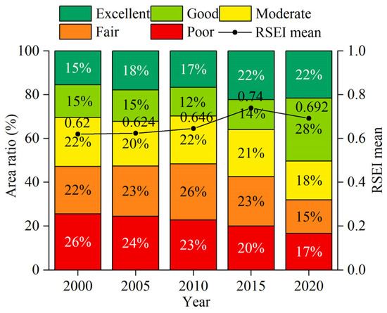 The percentage of RSEI areas in different classes and the mean of RSEI in 2000, 2005, 2010, 2015, and 2020.