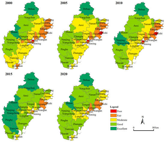 Looking at the average RSEIs for the county administrative districts, most districts have significantly improved their RSEI ratings (Figure 4). Compared with the number of districts with a moderate RSEI (from 9 to 10), those with a poor RSEI decreased from 12 to 4 districts in county-level administrative areas, while those with excellent RSEI and good RSEI increased from 7 to 13 districts. These changes indicate that the EQ of the Fujian Delta region has improved.