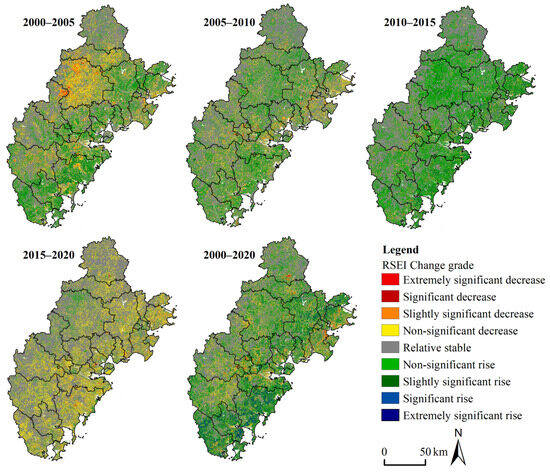 From 2000 to 2020, the spatial distribution of RSEI was generally higher in the western part and lower in the eastern region (Figure 2). Compared to 2000–2010, the RSEI increased in the northwest and southwest during 2015–2020, while it remained low along the northeast coast.