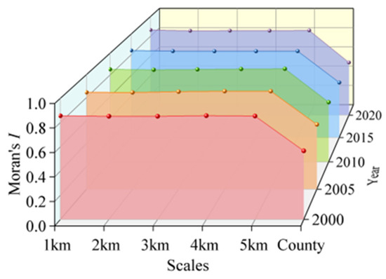 Moran’s I of RSEI at different scales from 2000 to 2020.