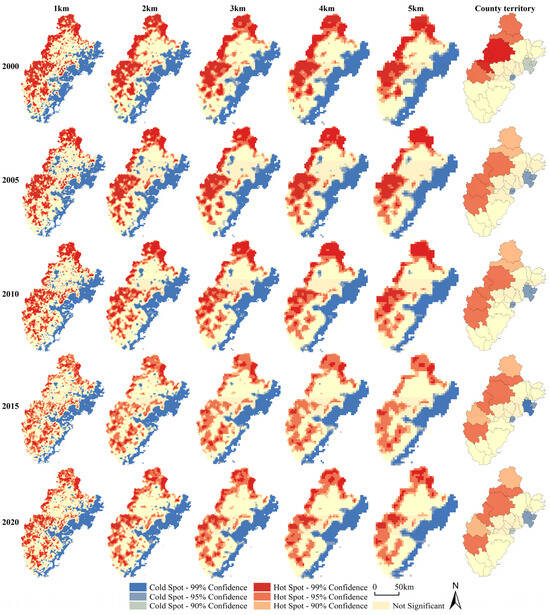 As a method to explore the characteristics of local spatial clustering distributions, hotspot analysis can be used to analyze how high or low values of RSEI are spatially clustered [63]. Since RSEI at the various scales have different spatial differentiation characteristics, grid scales (1, 2, 3, 4, and 5 km) and county scales were set. The calculations were performed using the Hot Spot Analysis tool in ArcGIS 10.7, and its detailed formulas are shown in Supplementary Materials (Appendix S2).