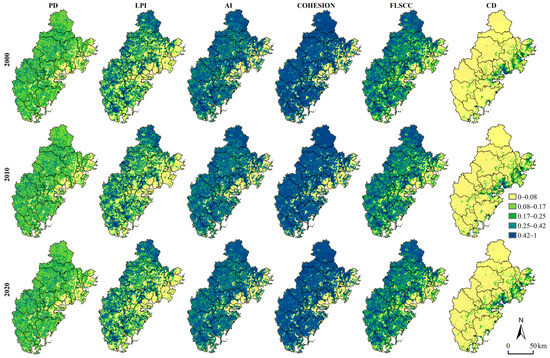 In general, the spatial distribution of PD, AI, LPI, COHESION, and FLSCC is similar, showing a decrease from the northwest to southeast (Figure 8). High values were mainly located in the west, south, and north, where the forest coverage rate was high with less human interference and higher structural connectivity of the landscape. In contrast, low values were predominantly found in the highly urbanized, human-intensive eastern part of the region, which has flat topography and low structural connectivity of the forest landscape. Low values of the CD were predominantly located in the north, west, and south, where the vegetation cover was higher, the distance from roads and construction land was greater, and the functional connectivity of the forest landscape was higher. High values of the CD were predominantly located in the east, where the road network was well-developed and the functional connectivity of the forest landscape was low.