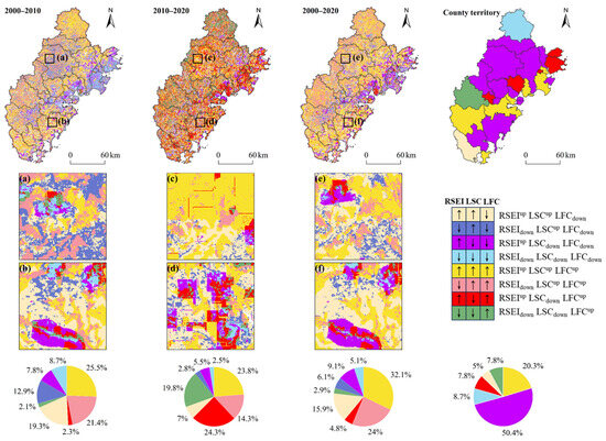 In addition, the framework was used to assess the dynamic pattern of RSEI and FLC at the county scale (Figure 9, Appendix S6). Taking the years between 2010 and 2020 as an example, most districts exhibited the following modes: RSEIupLSCdownLFCdown mode (n = 13), RSEIupLSCupLFCup mode (n = 7), and RSEIupLSCdownLFCup mode (n = 5). Only three counties showed a unique dynamic pattern of RSEI and FLC, as follows: RSEIdownLSCdownLFCdown (Dehua County), RSEIupLSCupLFCdown (Zhao’an County), and RSEIdownLSCdownLFCup modes (Nanjing County).