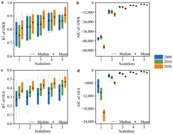 The GWR and OLS analyses were conducted for PD, LPI, AI, COHESION, FLSCC, CD, and RSEI from 2000 to 2020. To verify the applicability and accuracy of the GWR model, this model was compared with the OLS based on R2 and AIC; the parameter estimations of the two models are shown in Figure 10. In 2020, from the perspective of model accuracy, the range in variation for R2 in the OLS models of different scales was 0.27–0.58, and the interpretation and fitting accuracy of the GWR models of different scales was able to reach up to 97%. On all scales, the simulation effect of the GWR was greater than that of the OLS, and the AIC was smaller than that of the OLS. Therefore, the GWR model has more advantages than the traditional OLS model.