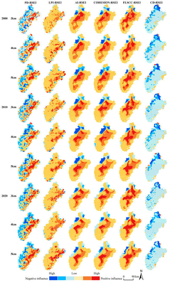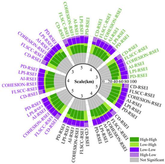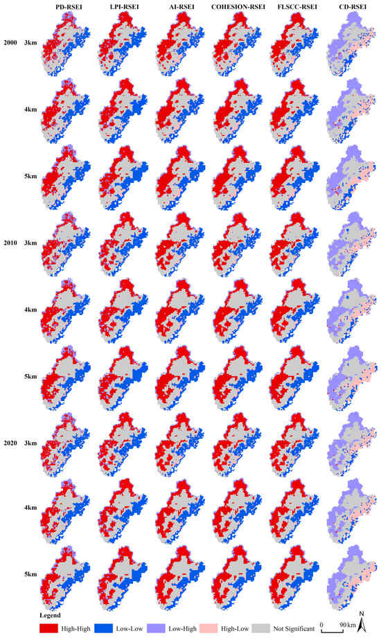 From 2000 to 2020, the mean values of Moran’s I for these forest landscape structural connectivity indices and the RSEI were all greater than 0.42 at the 3, 4, and 5 km scales (Table 3), indicating that a significantly positive spatial correlation existed between them. The positive spatial correlation became more pronounced as the scale increased. The CD-RSEI Moran’s I was always less than −0.43, indicating that a significantly negative spatial correlation existed in CD-RSEI. With an increase in scale, the spatial negative correlation first decreased and then increased. Over time, the spatial aggregation effect was significantly enhanced.