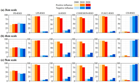 The area proportion of positive and negative regression coefficients between the forest landscape connectivity index and RSEI at different scales from 2000 to 2020.