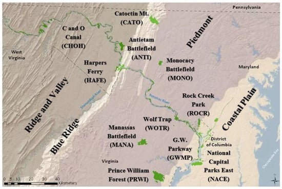 This study took place in the NCRN of the US National Park System (NPS) (Figure 1), which is located within the Eastern US deciduous forest ecological zone and spans three states (Maryland, Virginia, and West Virginia) and four physiographic provinces (the Coastal Plain, the Piedmont, the Blue Ridge, and the Ridge and Valley) [35].