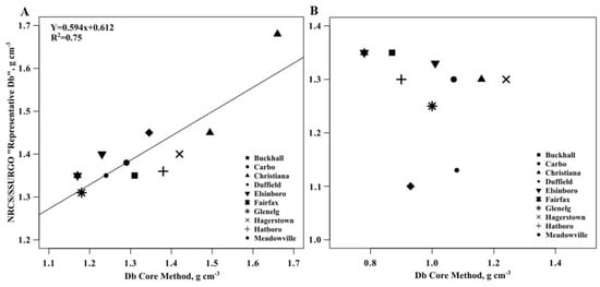 Relationship between SSURGO representative Db values and mean Db measured using the core method. (A) E and B horizons at 24 plots for the 10 soil series encountered at more than one sample point. (B) A horizons at 24 plots, a total of 10 soil series. No significant relationship was found.