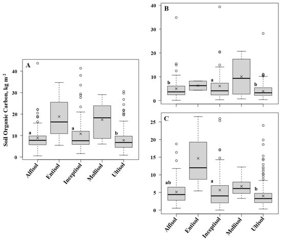 Box and whisker plots of SOC stocks according to taxonomic soil order; (A) in the top meter, (B) in the A horizon, and (C) in the B horizon. The box contains 50% of the values (the 25th and 75th percentiles) and the “whiskers” are the 2.5th and 97.5th percentiles. The “x” point indicates the mean and open circles represent values 1.5 times greater than the interquartile range. Tukey’s HSD was conducted to determine differences among groups. Values with the same lower-case letter do not differ at p > 0.05. Entisols and Mollisols were excluded from statistical comparison because they comprised < 2% of the plots.