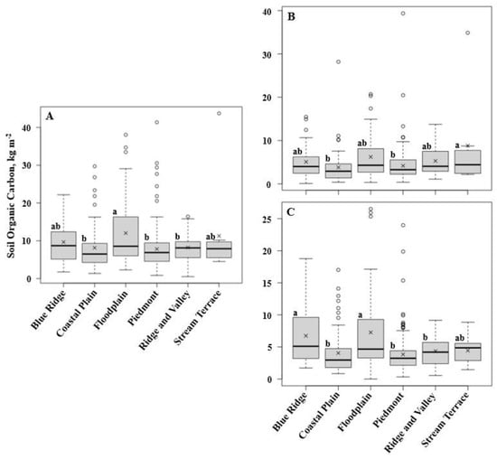 Box and whisker plots of SOC stocks by physiographic province; (A) in the top meter, (B) in the A horizon, and (C) in the B horizon. The box contains 50% of the values (the 25th and 75th percentiles) and the “whiskers” are the 2.5th and 97.5th percentiles. The “x” point indicates the mean and open circles represent values 1.5 times greater than the interquartile range. Tukey’s HSD was conducted to determine differences among groups. Values with the same lower-case letter do not differ at p > 0.05.
