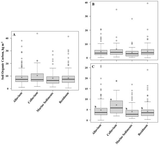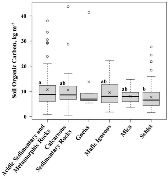 Mean mass of SOC per unit area for each parent material rock type. The box contains 50% of the values (the 25th and 75th percentiles) and the “whiskers” are the 2.5th and 97.5th percentiles. The “x” point indicates the mean and open circles represent values 1.5 times greater than the interquartile range. Tukey’s HSD was conducted to determine differences among groups. Values with the same lower-case letter do not differ at p > 0.05.
