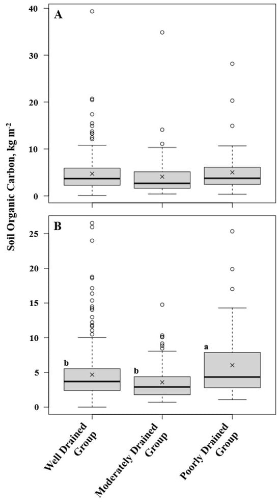 Box and whisker plots of SOC stocks according to soil drainage group; (A) in the A horizon, and (B) in the B horizon. The box contains 50% of the values (the 25th and 75th percentiles) and the “whiskers” are the 2.5th and 97.5th percentiles. The “x” point indicates the mean and open circles represent values 1.5 times greater than the interquartile range. Tukey’s HSD was conducted to determine differences among groups. Values with the same lower-case letter do not differ at p > 0.05.