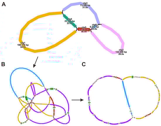 - Wick, R.R.; Schultz, M.B.; Zobel, J.; Holt, K.E. Bandage: Interactive visualization of de novo genome assemblies. Bioinformatics 2015, 31, 3350–3352. [Google Scholar] [CrossRef]