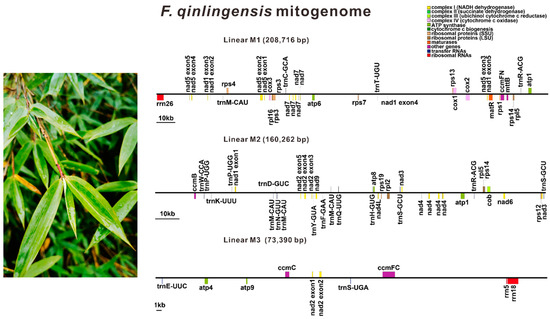 To date, very few high-quality bamboo mitogenomes have been reported in public databases, although it is known that they have undergone complicated and unusual evolutionary events across diverse families. In recent decades, technological advances in high-throughput sequencing have enabled the discovery of the entire mitogenomes of various plant species, providing essential insights into genetic diversity, evolution, and biogeography [22]. Given the few cases of the fast Illumina reads used for bamboo mitogenome assembly, high-quality mitogenomes are rarely available in the genus Fargesia [23]. Thus, dissecting the physiological functions of critical mitochondrial genes for stress/growth-related traits remains challenging. To achieve this goal, by integrating the Illumina and PacBio HiFi hybrid sequencing assays, the first high-quality mitogenome of the F. qinlingensis was resolved, revealing a structure of multi-branched conformation with three linear molecules (M1, M2, and M3), which have available NCBI accession GenBank IDs (OP324798, OP324799, and OP324800). We further performed genome annotation, collinearity, and phylogenetic analyses to understand the conserved patterns and evolutionary significance of F. qinlingensis and other lineages in the Poaceae. Our findings provide a theoretical basis for elucidating the genetic evolution of mitochondrial DNA underlying climate resilience in subalpine bamboo.