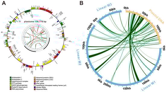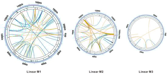 Many long repetitive sequences, including tandem and dispersed repeats, which determine structural variations, are generated in plant mitogenomes through genome recombination [44]. Simple sequence repeats (SSRs) are uncommon tandem repeats (7–200 bp) less than 6 bp in length. The cyclic maps illustrated the distributions and links of the repetitive sequences, including palindromic and forward repeats, tandem repeats, and SSRs, across the three linear mitogenome molecules (Figure 4). Approximately 51, 28, and 14 SSRs were identified primarily in monomeric and dimeric repetitive forms, accounting for 41.18%, 42.86%, and 50.00% of the linear molecules, M1, M2, and M3, respectively (Table S6). A total of 42 tandem repeats (24 in M1,16 in M2, and 2 in M3) were observed, ranging in size from 11 to 41 bp. In addition, dispersed repeats frequently occurred in the particular forms of forward repeats/palindromic repeats detected, with 71 (46/25) in M1, 72 (34/38) in M2, and 10 (6/4) in M3 (Tables S7 and S8).