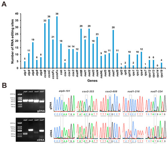 Prediction of RNA-editing sites in 35 PCGs and the experimental evaluation. (A) PCR amplification was conducted using DNA and cDNA as templates. (B) Experimental confirmation of the RNA-editing sites in selected PCGs (atp9-191, cox2-353, -608, nad1-216, and nad7-224), showing the exemplified C to T changes (dotted line framed) via Sanger sequencing.