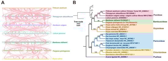 Collinearity and evolutionary relationships between F. qinlingensis and other plants. (A) Synteny analyses of seven mitogenomes within Pooideae and Bambusoideae. Pink-curved ribbons represent DNA inversion regions, and gray-curved ribbons indicate sites with high homology. Collinear blocks with sequence lengths < 0.5 kb were not retained. (B) Phylogenetic relationships between F. qinlingensis and 28 genetically related species shown using full-length mitogenome sequences. This unrooted tree was constructed using the neighbor-joining method.