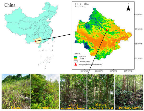 The study area is situated within the Nonggang National Nature Reserve in Longzhou County, Guangxi, southwestern China (106°42′28″–107°04′54″ E, 22°13′56″–22°39′09″ N, Figure 1). This area is primarily characterized by karst landforms formed on carbonate rocks, featuring typical peak–cluster depression topography with elevations ranging from 300 to 600 m. Positioned south of the Tropic of Cancer, the area has a classic tropical monsoon climate, with ample solar radiation, high temperatures, and an average annual temperature of 22 °C. The coldest month has an average temperature exceeding 13 °C for 7 months, indicating an extended warm season. Annual rainfall averages from 1150 to 1550 mm. It is primarily concentrated between May and September, delineating distinct wet and dry seasons. The soil attributes included a low total volume, shallow soil layers, discontinuous soil coverage, and uneven spatial dispersion. The primary formation lithology consists of Devonian, Carboniferous, and Permian carbonate rocks. The soil is calcareous, formed from limestone, and is characterized by high pH levels and an abundance of magnesium (Mg) and calcium (Ca) compounds. According to the Chinese Soil Taxonomy, this soil can be further subdivided into the brown limestone soil subclass. It is also categorized as Calcaric Cambisol in the World Reference Base (WRB) for Soil Resource. Karst vegetation in this location shows exceptionally high diversity and endemism, with a total of 1725 vascular plant species. Noteworthy among these are protected wild plants, such as Cycas sexseminifera F.N.Wei, Cycas bifida (Dyer) K.D.Hill, Excentrodendron tonkinense (A. Chev.) H. T. Chang and R. H. Miao, Firmiana kwangsiensis H. H. Hsue, Deutzianthus tonkinensis Gagnep., Camellia flavida Hung T. Chang, and Horsfieldia hainanensis Merr.