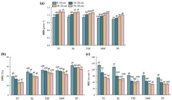 Distribution characteristics of soil physical factors at different stages. (a) SBD, soil bulk density; (b) SWC, soil water content; and (c) SEC, soil electrical conductivity. Different lowercase letters indicate significant differences between different soil layers (p < 0.05), and different capital letters indicate significant differences between different restoration stages (p < 0.05). TU, tussock; SL, shrubland; YSF, young secondary forest; MSF, mature secondary forest; PF, primary forest.