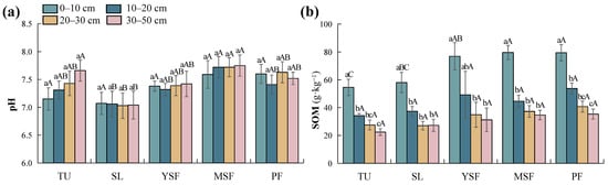 Distribution of (a) soil pH and (b) soil organic matter (SOM) at different restoration stages. Different lowercase letters indicate significant differences between different soil layers (p < 0.05), and different capital letters indicate significant differences between different restoration stages (p < 0.05). TU, tussock; SL, shrubland; YSF, young secondary forest; MSF, mature secondary forest; PF, primary forest.