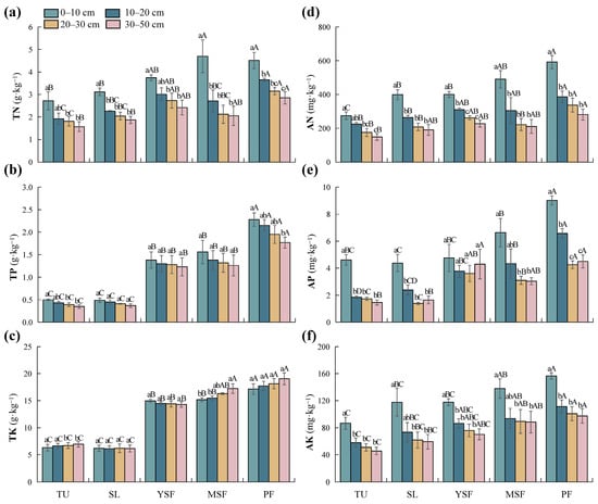 Distribution of soil nutrient factors at different restoration stages. (a) TN, total nitrogen; (b) TP, total phosphorus; (c) TK, total potassium; (d) AN, alkali-hydrolyzed nitrogen; (e) AP, available phosphorus; and (f) AK, available potassium. Different lowercase letters indicate significant differences between different soil layers (p < 0.05), and different capital letters indicate significant differences between different restoration stages (p < 0.05). TU, tussock; SL, shrubland; YSF, young secondary forest; MSF, mature secondary forest; PF, primary forest.