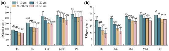 Distribution of soil (a) exchangeable calcium (ECa) and (b) exchangeable magnesium (EMg) at different restoration stages. Different lowercase letters indicate significant differences between different soil layers (p < 0.05), and different capital letters indicate significant differences between different restoration stages (p < 0.05). TU, tussock; SL, shrubland; YSF, young secondary forest; MSF, mature secondary forest; PF, primary forest.
