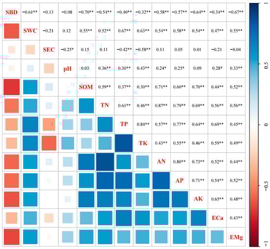 Correlation analysis of soil physicochemical properties. The blue indicates positive correlation, and the red indicates negative correlation. Numbers indicate the correlation coefficients. p-values were used to test the level of significance for hypothesis testing. * and ** indicate p < 0.05 and p < 0.01, respectively. SBD, soil bulk density; SWC, soil water content; SEC, soil electrical conductivity; SOM, soil organic matter; TN, total nitrogen; TP, total phosphorus; TK, total potassium; AN, alkali-hydrolyzed nitrogen; AP, available phosphorus; AK, available potassium; ECa, exchangeable calcium; EMg, exchangeable magnesium.