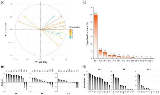 The PCA results for the soil physicochemical factors are shown in Figure 7a. Following the criterion of eigenvalues greater than one, the first three principal components were retained, with a cumulative contribution rate of 79.81% (Figure 7b). The cumulative contribution rate of the first principal component was 58.92%, mainly reflecting the contributions of TK (loading: 0.92; contribution: 10.94%; Figure 7c,d), TP (loading: 0.91; contribution: 10.68%), and AP (loading: 0.88; contribution: 10.03%). Meanwhile, that of the second principal component was 12.77%, mainly reflecting the contributions of SOM (loading: −0.56; contribution: 21.62%), TN (loading: 0.50; contribution: 17.08%), and SBD (loading: 0.50; contribution: 16.81%). The cumulative contribution rate of the third principal component was 8.35%, reflecting the contributions of EMg (loading: −0.62; contribution: 34.43%), pH (loading: −0.60; contribution:32.76%), and AK (loading: 0.33; contribution: 9.84%).