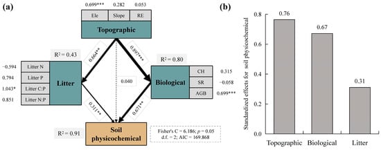PiecewiseSEM pathway analysis of soil physicochemical characteristics. (a) Path analysis diagram for each factor and (b) their standardized effects for soil physicochemical characteristics. Soil physicochemical characteristics were derived from PCA. The dashed line indicates that the regression results are not significant, and the solid line is significant. The thickness of the line indicates the size of the path coefficient, and the numbers next to the line represent regression coefficients; * p < 0.05, ** p < 0.01, and *** p < 0.001. Ele, elevation; RE, rock exposure; Litter N, litter nitrogen; Litter P, litter phosphorus; Litter C:P, litter carbon–phosphorus ratio; Litter N:P, litter nitrogen–phosphorus ratio; CH, community height; SR, species richness; AGB, aboveground biomass.