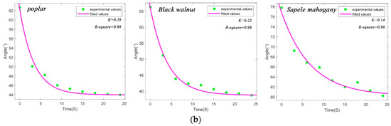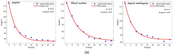 Measuring the equilibrium contact angle is an important method for evaluating the wettability of solid surfaces. However, wood has strong hygroscopicity, causing the test liquid to be absorbed by wood. Therefore, most research literature uses the contact angle after the liquid has been stationary for a few seconds to several tens of seconds as the equilibrium contact angle [35]. However, after plasma modification, the hygroscopicity of the wood surface is further enhanced, making contact angle measurement inaccurate. This study used equation fitting to accurately determine the contact angle measurement time [36,37,38].