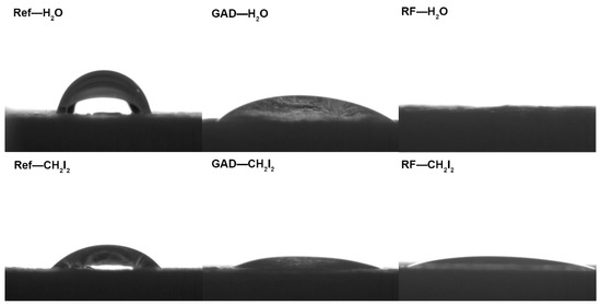 Calculations based on measured contact angles and OWRK theory suggest that after RF plasma treatment, the total surface energy of poplar doubled, with polar and dispersive surface energy increased by 800% and 33%, respectively. GAD-treated poplar showed a smaller increase in surface energy than RF-treated poplar, but the total surface energy, polar surface energy, and dispersive surface energy increased by 76%, 532%, and 30%, respectively, compared to untreated samples. The increase in surface energy resulted in reduced contact angles for liquids on plasma-treated wood, causing the test liquids to spread more evenly over the solid surface, as shown in Figure 2 for two test liquids on poplar at time te. Black walnut and sapele exhibited similar behavior to poplar, as shown in Table S2, consistent with the results in most of the literature [40,41]. For homogeneous, smooth, and non-porous surfaces, changes in contact angle can correspond to changes in surface energy and reflect changes in wettability. However, for porous materials like wood, directly using surface energy theory to relate to wettability and concluding that the activation capability of GAD is weaker than RF are likely incorrect.