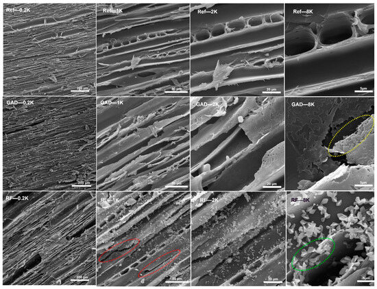 After GAD treatment, the most noticeable etching phenomenon is the lamellar peeling of the wood’s surface structure. This peeling phenomenon is clearly visible in the GAD-8K figure with the yellow circle in Figure 3. None of the GAD-treated samples showed uniform wood cracks. The average energy of active particles in GAD is only about 2 eV, which is insufficient to cause significant etching marks through impact, but its ability to induce oxidation reactions far exceeds that of other plasma discharge types, as discussed in numerous studies [21,44]. Combined with subsequent EDS and XPS surface analyses, it can be inferred that active particles in GAD cause oxidation reactions on the wood surface, leading to the preferential decomposition of lignin, which forms O-C=O, O-C-O, and C=O bonds through oxidation. This indicates that the peeling phenomenon in GAD is, in fact, the result of lignin decomposition on the wood surface, leaving these groups bonded to the wood surface, containing many oxygen-containing groups [11,15,16]. This surface peeling phenomenon is caused by the oxidation reaction initiated by active substances by GAD. Although it appears similar to etching on the surface, it can be referred to as “chemical etching”. Figure S4 shows similar etching marks on black walnut and sapele, indicating similar regular surface peeling phenomena.